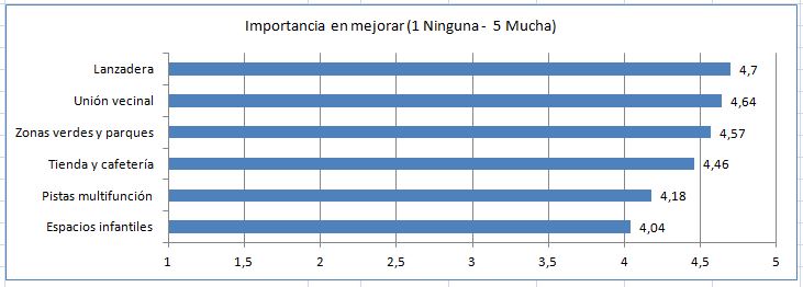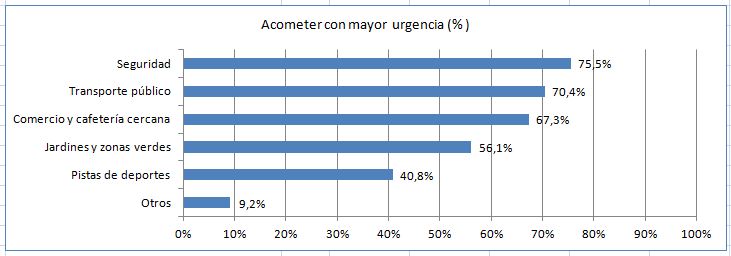 En general, los encuestados demandan acciones correctivas urgentes ante el deterioro de infraestructuras y notoria deficiencia en los servicios públicos. Y acometer cuanto antes: Transporte público urbano (lanzadera), comercio/cafetería cercana (en área colegio-guardería-futura residencia para mayores), zonas verdes, pistas de deportes (multifunción) o acceso rápido a la segunda circunvalación (necesidad señalada en comentarios de la encuesta y en las redes sociales).