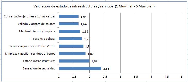 Por áreas el resultado es el siguiente: Conservación de jardines y zonas verdes (1,64 sobre 5), vallado y ornato de solares (1,64 sobre 5), mantenimiento y limpieza en general (1,69 sobre 5), presencia policial (1,76 sobre 5), limpieza y gestión de residuos urbanos (1,87 sobre 5) y estado de infraestructuras (1,99 sobre 5).