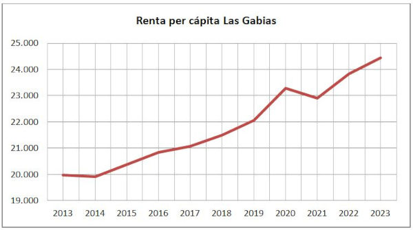 En 2023 el PIB per cápita de la UE fue de 41.950€, el PIB per cápita de España fue de 30.968€, el de Andalucía de 23.218€ y el de la provincia de Granada de 10.711€. Del municipio de Las Gabias no se tiene datos del PIB per cápita, pero sí de la renta bruta per cápita que en 2023 fue de 24.440€ y va en aumento; no es exactamente igual pero es orientativa (la renta bruta per cápita se refiere a los ingresos medios por persona mientras que el PIB per cápita mide la producción económica por persona).