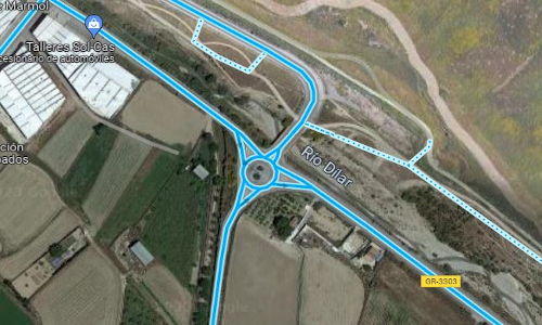 Como se puede apreciar en la imagen superior el recorrido, paralelo al río Dílar, es una línea recta tangencial a la rotonda la cual puede llegar a pasar desapercibida para los conductores que provienen de Alhendín y van con destino al polígono, si no se presta bastante atención, ya que hay obstáculos que impiden la visión del conjunto.